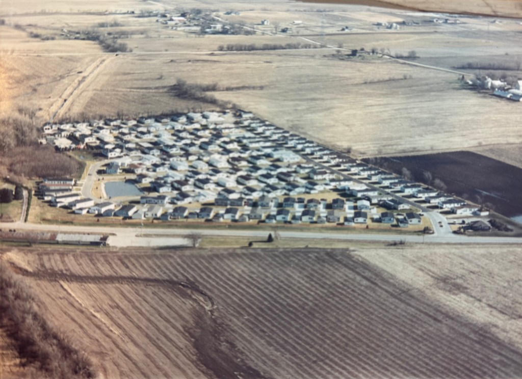 Aerial view of Gateway Housing Development, the pioneering first development in the area. Taken prior to Gateway being compelled to connect to municipal water and sewer. View Looking West towards La Grange Rd and Steger Rd. Intersection. Photograph by Mike Rose.